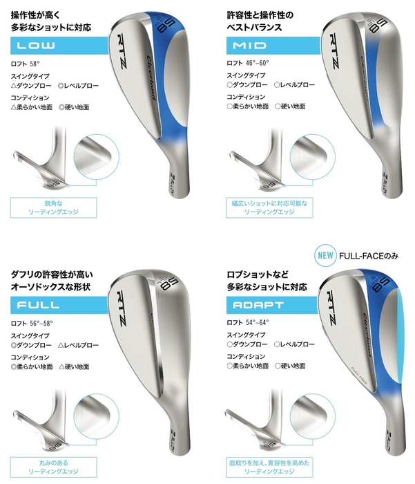 硬い砂、やわらかい砂のバンカーや深いラフなど、さまざまなシーンを想定し、ロフト別にソール形状を最適に設計しました。また、FULL-FACEだけのオリジナル形状「ADAPT」をラインアップしました。