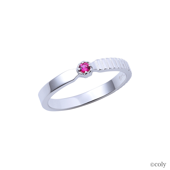 「魔法使いの約束」に登場する北の国の魔法使い、ホワイトをイメージしたシルバーリングです。衣装のリボンをモチーフとしてリングに取り込んだV字タイプのデザインに、イメージカラーストーンをセット。内側には魔道具のアイコンを刻印しました。スノウのリングとお揃いのデザインです。