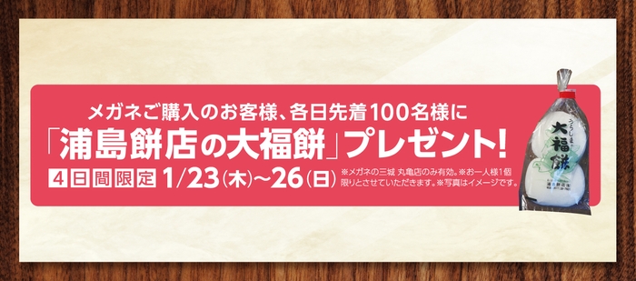オープン4日間限定イベントとして「浦島餅店の大福餅」を、メガネの三城 丸亀店にてメガネご購入のお客様に各日先着100名様にプレゼントいたします。