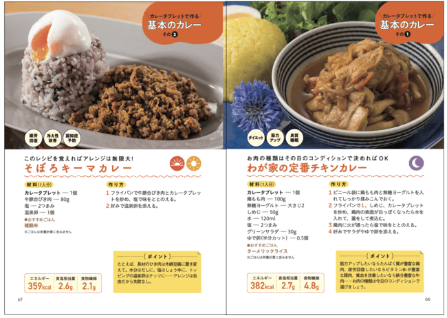 本書では、カレータブレットで作る基本のカレーからおにぎり、リゾット、オムレツ、生姜焼き、八宝菜、レバニラ、いかの姿焼き、スープといったメニューのほか、季節に適したカレーや糖質オフカレー、残り物リメイクカレー、カレーバターやカレーマヨで作るアレンジメニューといった新しいアイデアまで60レシピをご紹介。