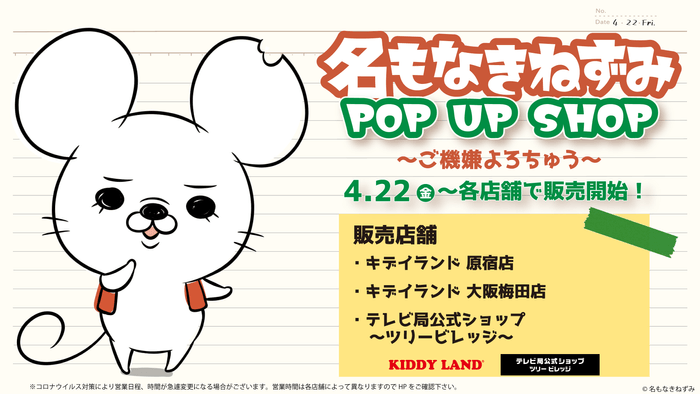 この度、4月22日(金)より、SNSやYouTubeで話題のキャラクター「名もなきねずみ」がキデイランド原宿店、大阪梅田店、テレビ局公式ショップ ~ツリー ビレッジ~(東京ソラマチ(R)内)にて初のPOP-UPイベントを開催する事となりました。