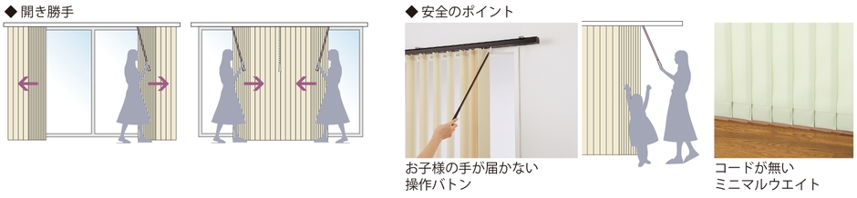 中央の操作バトンで両開き、左右のバトンでルーバーの開閉・回転操作ができます。操作部は小さなお子様の手が届かない高さにあり、ルーバーどうしをつなぐコードも無いため、引っかかる心配がない安全な商品です。操作バトンは抗菌仕様で、ルーバーは1枚ずつ外して洗濯可能※なので、安心してご使用いただけます。小さなお子様がいらっしゃるご家庭のほか、保育施設や各種施設のキッズルームなどにもおすすめです。※ウォッシャブル生地のみ