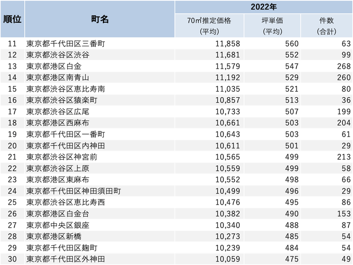その第1弾として、2022年の中古マンション価格ランキングにおいて、年間を通して上位5位までを占めた東京都千代田区・中央区・港区・目黒区・渋谷区の5区について、町名単位での2022年中古マンション価格の最新ランキングを発表いたします。
