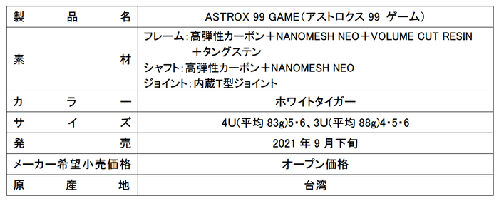 ヨネックス株式会社(代表取締役社長:林田 草樹)は、世界のトップ選手たちが信頼をよせているASTROXシリーズから、さらにショットの威力と球持ちが向上したバドミントンラケット上級者、選手層向け「ASTROX 99 PRO」、中級者向け「ASTROX 99 GAME」を2021年9月下旬より発売いたします。