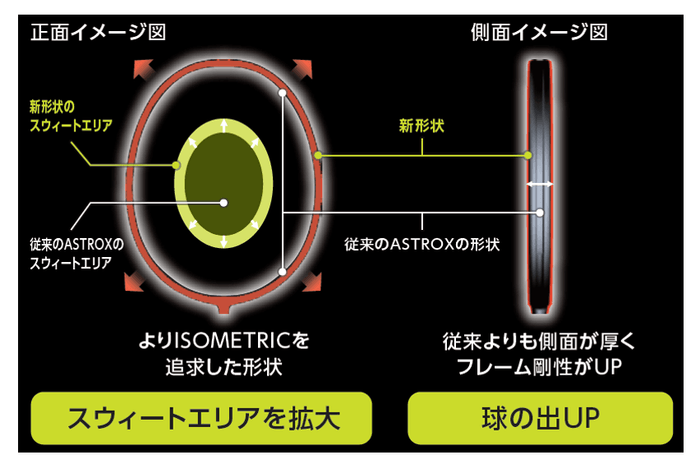 従来品よりもフレームを四角形に近づけ、弊社独自の形状理論「ISOMETRIC(アイソメトリック)」をさらに追求した新形状に改良し、スウィートエリアが拡大。オフセンターでも威力のあるショットを繰り出せます。また、フレーム側面を厚くすることで剛性を高め球の出を良くしました。