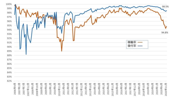 ※1 稼働率は、稼働件数÷当社賃貸物件数で算出。2012年3月に事業再編により店舗数の補正があります。