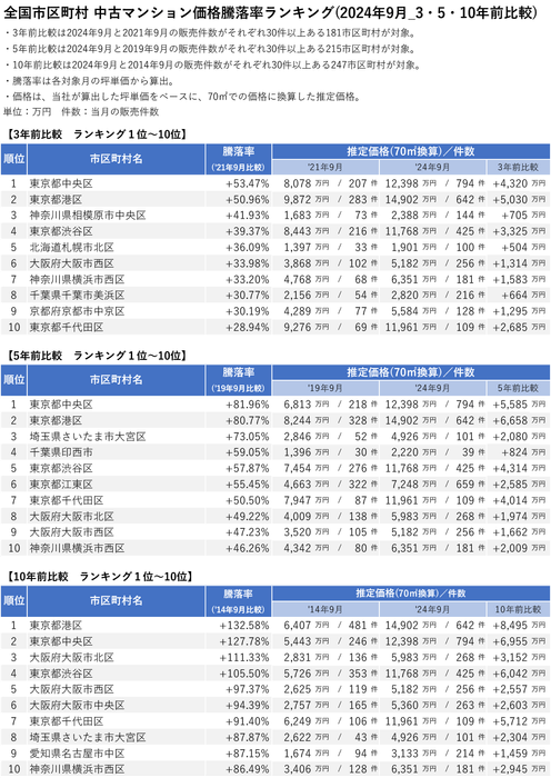 全国市区町村 中古マンション騰落率ランキング(2024年9月_3・5・10年前比較)