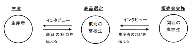 関西の高校生と宮城、福島、岩手の高校生がタッグを組み、参加総勢約50名が現地生産者の想いを届ける物販コーナーにて、東北ならではの約35種類の美味が登場します。