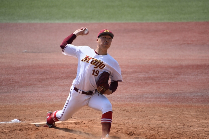 投手陣は、リーグ戦初先発の藤井輔投手(経営学部4年)が6回途中まで8奪三振、2失点と粘りのピッチングを見せると、6回は伊藤達葵投手(法学部4年)、7回は大嶽一惺投手(経済学部2年)がともに無失点に抑え、8、9回は天野京介投手(人間学部2年)が最速153㌔の直球を軸に打者6人を完璧に抑えて反撃を封じ、勝利を決めました。