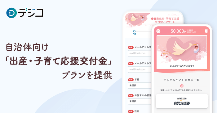 「デジコ」は、「出産・子育て応援給付金事業」のデジタル化を全面的に支援する「出産・子育て応援交付金プラン」を提供しています。自治体が伴走型相談支援のために必要とする対象者へのアンケートから、出産・子育て応援交付金として使えるデジタルギフト「デジコ」の発行・送付までを一気通貫で提供いたします。また、ギフトの交換先を「Amazon育児支援券(※)」にすれば、交付金の利用用途を育児関連商品に限定することも可能です。
