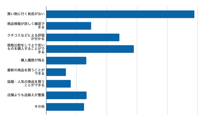 メリットに関しては「買い物に行く負担がない」が圧倒的で、次に「価格比較をしてより安いものを購入することができる」「クチコミなどによる評価が分かる」などの回答が多くみられました。