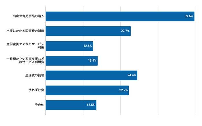 使い道に関しては「出産や育児用品の購入」という回答が最も多く、次いで「生活費の補填」、「出産にかかる医療費の補填」、「使わずに貯金」という回答が多くみられました。