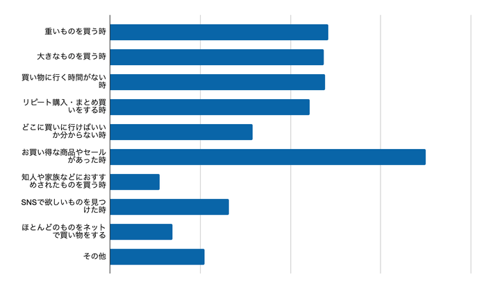 子育て世代の総合オンラインショップの利用は、「お買い得な商品やセールがあった時」が圧倒的で、次いで「重いもの・大きなものを買う時」「買い物に行く時間がない時」などの回答が多くみられました。