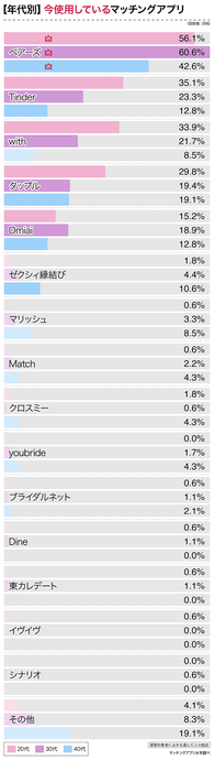 年代別で見ても、すべての年代において「ペアーズ」が1位でしたが、2位以下には違いがみられました。20代の2位以下は「Tinder」「with」「タップル」の3つがいずれも3割前後とほぼ横並びで、5位の「Omiai」(15.2%)へと続きます。