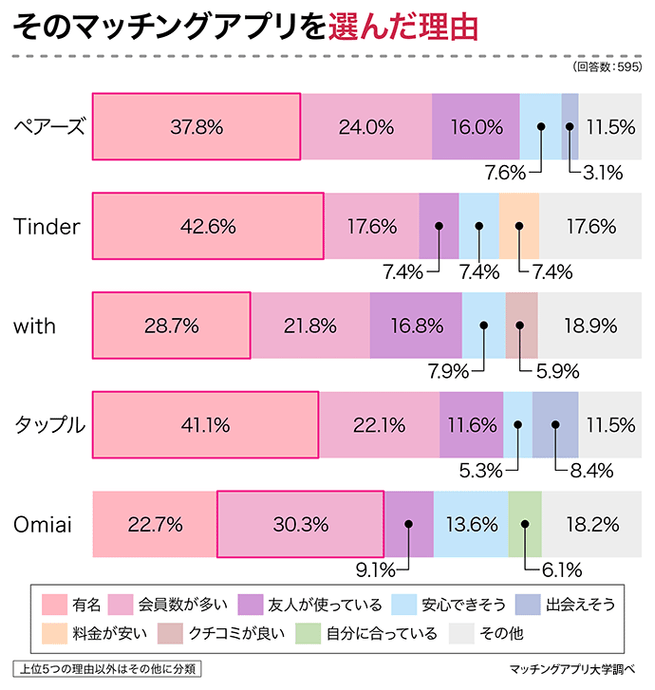 利用されているマッチングアプリは、ペアーズ・Tinder・タップル・Omiai・withの5強