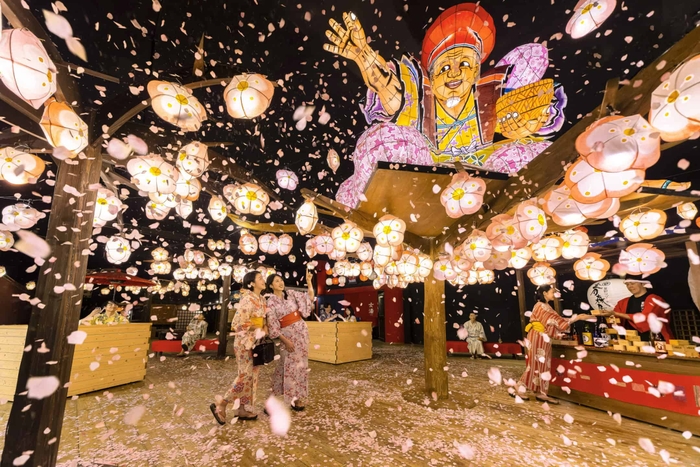 【青森屋】ねぶた花咲かじいさんが約200個のりんごの花型灯篭を咲かせる「たんげ花咲かまつり」開催 ~桜柄の浴衣を着て、花見酒片手にゆったり過ごす~|期間:2023年4月5日~5月31日