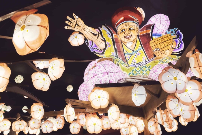青森屋のパブリックスペース「じゃわめぐ広場」の大きなりんごの木の上にに、イベントのシンボルとして、「ねぶた花咲かじいさん」が登場します。広場内には花咲かじいさんが咲かせた約200個のりんごの花型灯篭が咲き、花見気分を楽しめます。