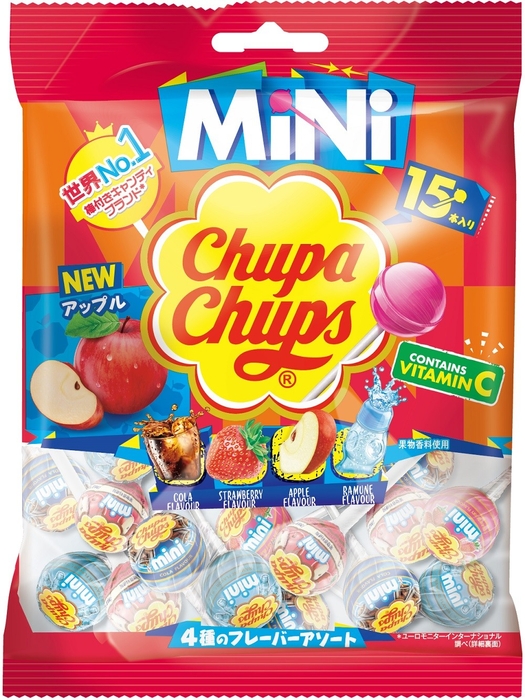 「チュッパチャプス ミニ アソートバッグ15本」は、通常サイズの半分で食べやすいミニスティックタイプ。定番人気の〈コーラ〉〈ストロベリー〉〈ラムネ〉に加え、今回の新フレーバー〈アップル〉を詰め合わせた4種類のアソートです。お子様やご家族、友達とシェアしながら、その時の気分に合わせて楽しめます。