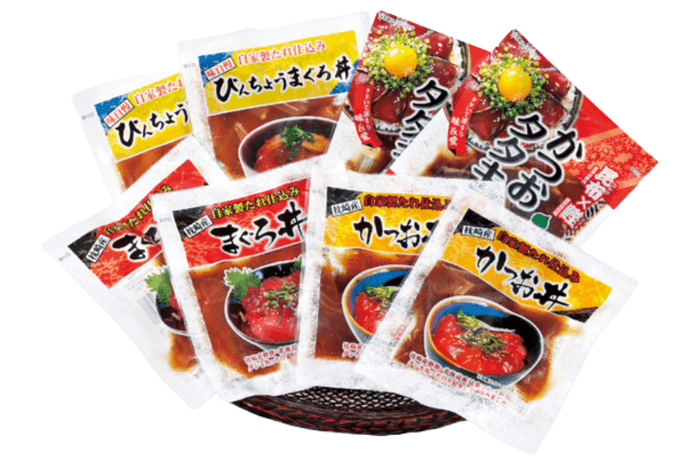 カツオやマグロを枕崎産のかつお節と北海道産の昆布でだしを取ったタレに漬け込みました。解凍してご飯に乗せるだけの簡単調理で、4種の味を食べ比べできるセットです。