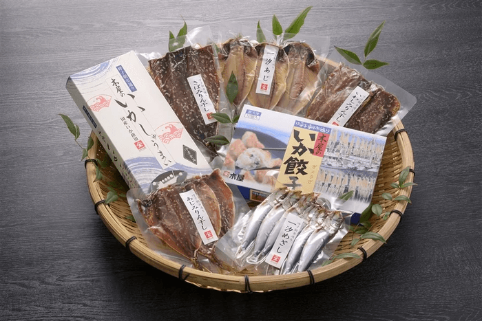 日本三大朝市のひとつ「呼子の朝市」から玄界灘の香りをお届けします。アジの開き、サバのみりん干し、いかぎょうざなどがセットになったお土産やご贈答にも最適の商品です。