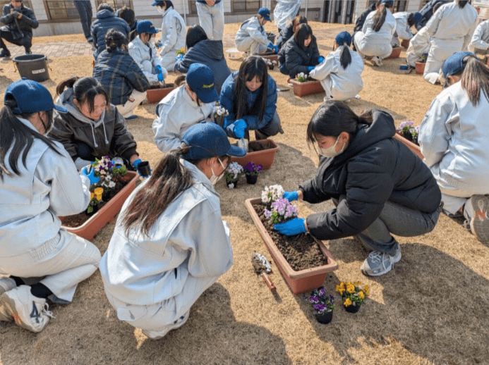 2025年1月30日(木)、フリースクール「IPUブリッジ」×瀬戸南高校園芸科学科による『100プランタープロジェクト』がスタートしました!高校2年生と教員がIPUブリッジを訪れ、学生団体アワーユニバース20名とともに、パンジーとビオラ約200株の植え付けを行いました。