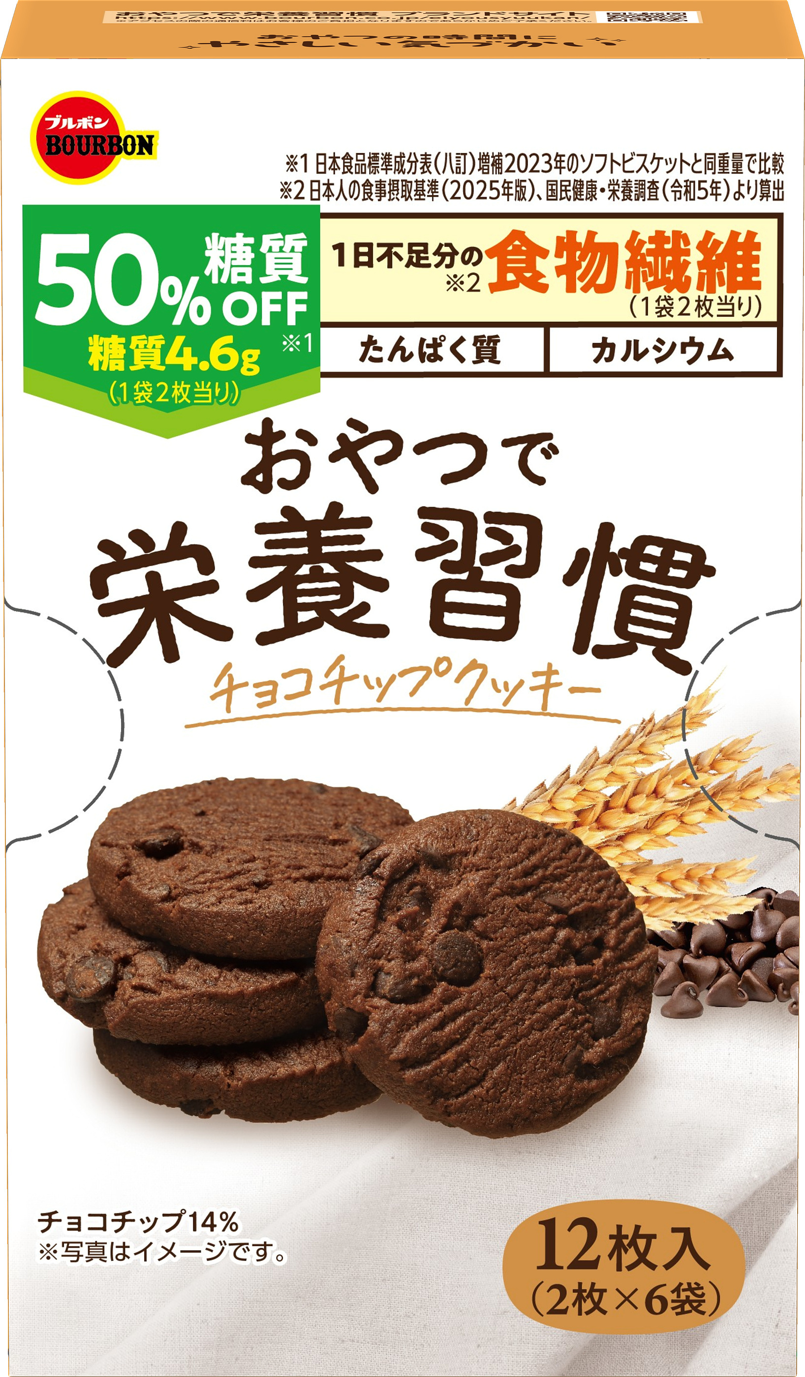 食物繊維をたっぷり配合した糖質50%オフ(※1)のチョコチップクッキーです。1個装2枚当りの糖質量は4.6gであり、糖質管理しやすい設計になっています。