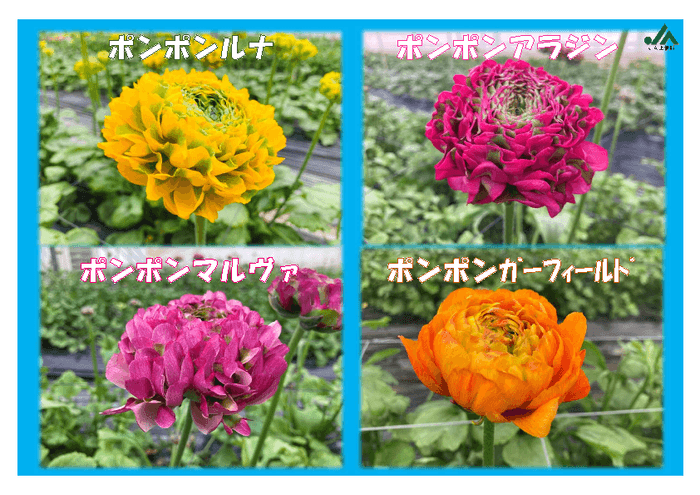 ラナンの紹介「ラナンキュラス(キンポウゲ科)」は、アルストロメリアやアネモネと並び、冬から春にかけて出荷される長野県の切り花の代表格であり、バラに似た花形や花色の豊富なことが特徴です。