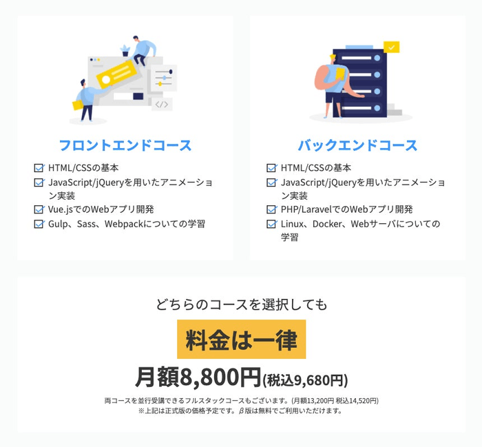 フロントエンドコース、バックエンドコースの2コースから選択するだけで、コースに合わせたカリキュラムのオンライン学習が可能になります。