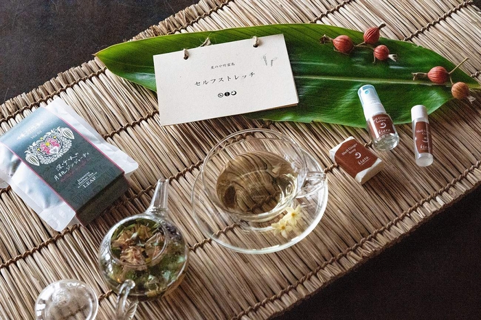 ストレスが溜まる要因のひとつには睡眠不足があると言われています。十分な睡眠のために、共通の就寝前のストレッチの指南書とアメニティ、各施設で異なるハーブティーを用意します。身体をストレッチでほぐし、ハーブティーで温めることで心地よい眠りへと誘う安らぎの時間です。また、アメニティとして用意したスキンケアセットは、添加物を使用せず、沖縄で馴染み深い月桃を中心に作られており、肌へのストレスを最小限に抑えます。
