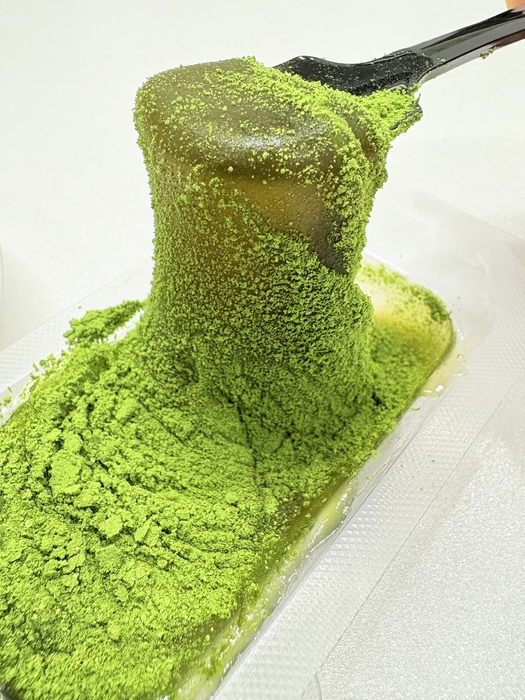 わらび餅そのものに、香り高い宇治抹茶を丁寧に練り込むことで、噛むほどに抹茶の豊かな風味が口いっぱいに広がります。さらに仕上げには、追い抹茶としてたっぷりの宇治抹茶をまぶしており、これにより抹茶本来の持つ奥深い香りと、上品なほろ苦さを最大限にご堪能いただける逸品に仕上げました