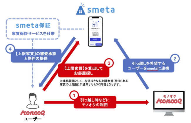 ●「モノオク」ユーザー: smetaを利用する際の上限家賃(借りられる家賃の上限となる与信枠)が通常より5,000円アップとなり、より幅広い選択肢からお部屋を選びやすくなります。