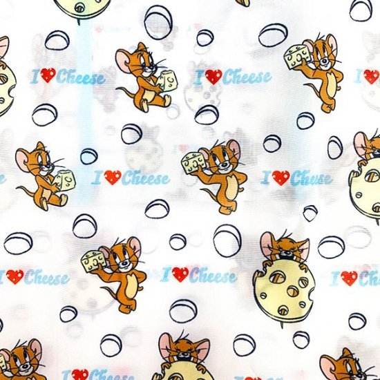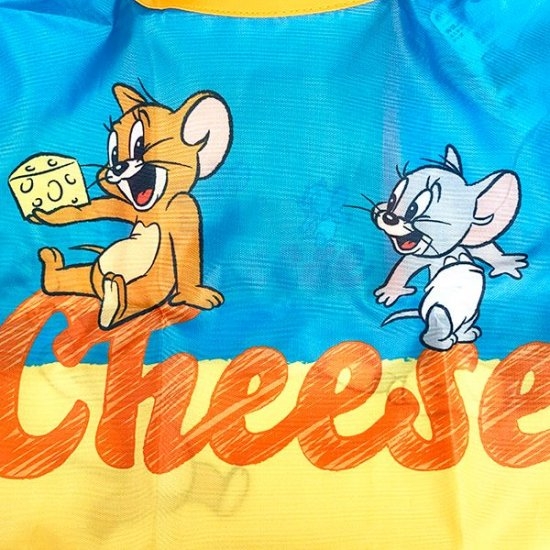 こちらは、イエロー地にジェリー&チーズデザインのエコバッグです。チーズの上に乗っかったり、いろいろなポーズのジェリーが総柄になっていてオススメのデザイン♪