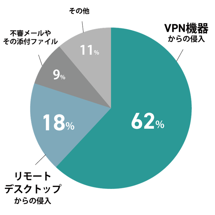 近年、企業の持つデータを暗号化するだけでなく、データを盗み取った上で「対価を支払わなければデータを公開する」などと金銭を要求するランサムウェアの被害が相次いでいます。その背景には、従来のUSB・WEB・メールに続く第四の侵入経路として企業の管理不十分な外部公開資産(ネットワーク機器やサーバ)が悪用されている状況があります。特にVPN機器からの侵入をきっかけとする被害は、被害総数の半数以上を占めており、企業にとって大きな脅威となっています。