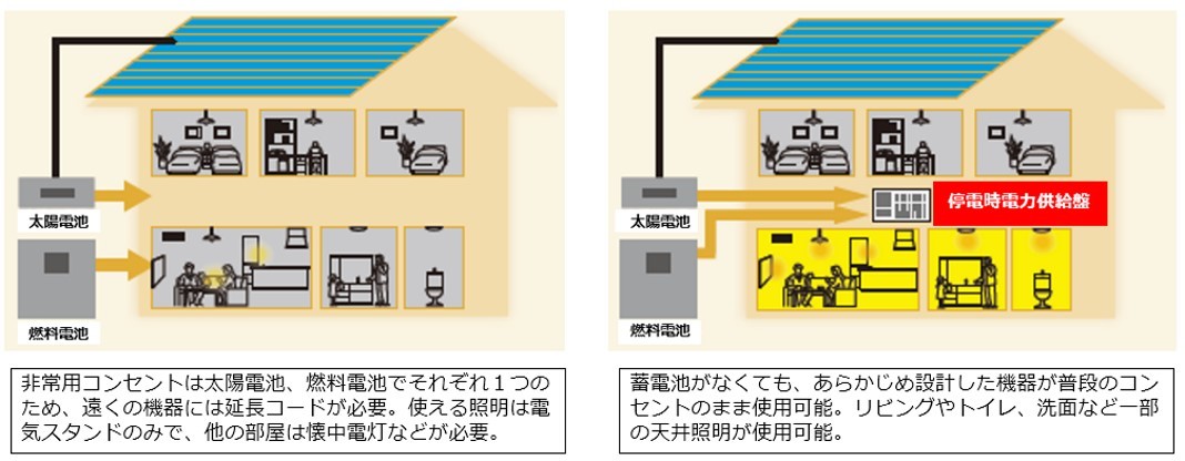 停電時でも太陽電池・燃料電池・蓄電池の3電池連携システムであれば、日常に近い形で生活ができます。しかし、太陽電池と燃料電池のみの場合、従来は停電時に非常用コンセントしか使うことができず、機器の移動や延長コードが必要でした。今回新設した停電時電力供給盤を介することによって、蓄電池がなくてもあらかじめ設計した機器(冷蔵庫、テレビ、電子レンジなど)が普段のコンセントのまま使用可能になります。また、一部の天井照明も使用可能です。