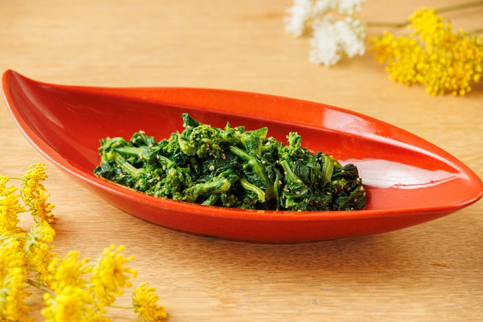堺市の「今野農園」で丁寧に育てられた菜の花を使用。ほろ苦い春の風味を活かし、ピリッとした辛子で和えることで、春ならではの味わいを引き立てました。菜の花は、地域の自然の恵みを感じられる食材でもあり、季節の移ろいを楽しめる一品です。