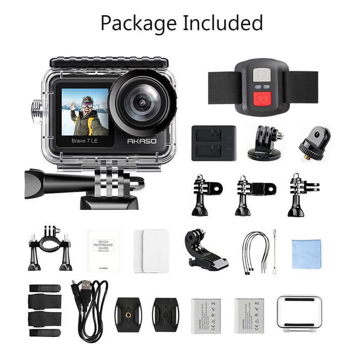 優れている機能に加えて、AKASO Brave 7 LEにはリモコン、2つの1350mAhバッテリなどアクセサリーが数多く付いています。IPX7基準の防水性(1メートルまで)の本体に40メートルまで潜水対応のケースも用意しました。