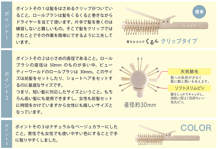 「ニュート」のクリップロールブラシジェンダーフリーへの3つの工夫