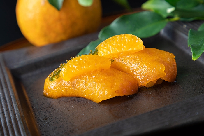 たんかんの皮を、蜜と酢で柔らかく煮て赤酢のシャリで。昔ながらの技法の珍しい寿司。色合いも楽しめます。