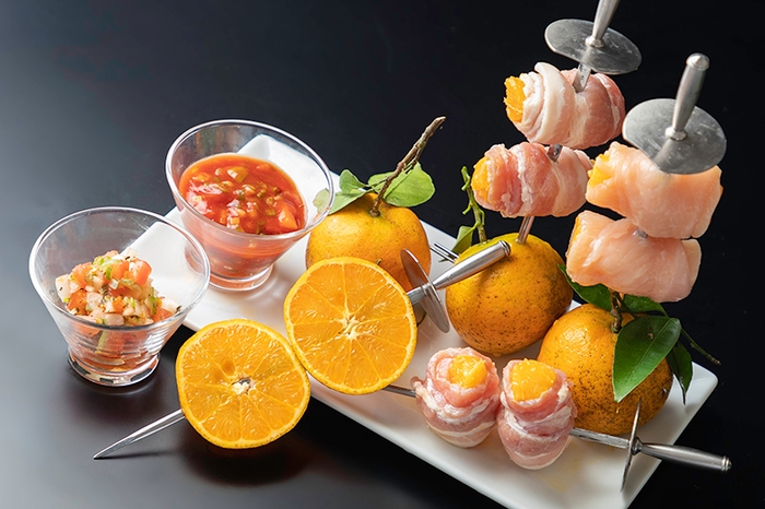 豚バラ肉とチキンでたんかんの身を包んだ串焼き。肉とフルーツの味わいをお楽しみください。