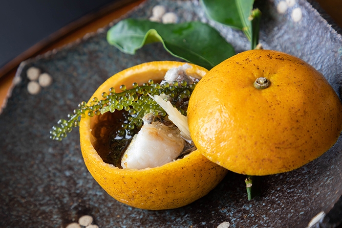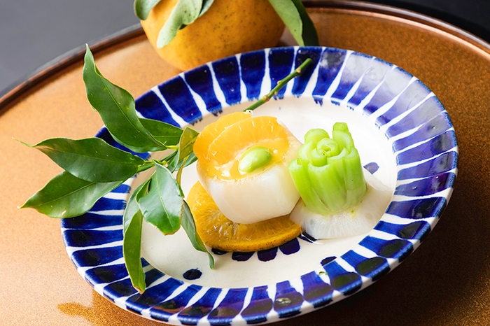 かぶらを昆布だしでゆっくりと炊き上げ、中をくりぬき、たんかん味噌を詰めた、春の息吹を感じる一品。
