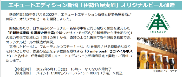 この度、鉄道開業150年を記念し、鉄道の起点を示す標識を意味する『0 mile post(ゼロマイルポスト)』と名付け、2022年5月13日(金)16時より、伊勢角屋麦酒エキュートエディション新橋店にて開栓いたします。今ここでしか味わえないオリジナルビールを、生でぜひお楽しみください。