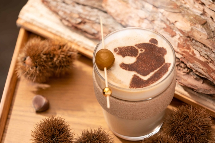軽井沢の森に暮らすツキノワグマは、秋は栗やどんぐりなどの木の実をたくさん食べて、冬眠に備えます。そんなツキノワグマをラテアートのモチーフにし、剥き栗を添えたマロンラテが新登場します。甘い栗の香りが漂う、秋限定のカフェラテです。