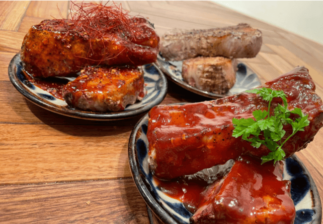 メインメニューは名物『スペアリブ』。裏メインとして女性に嬉しいスイーツをつまみにした独自メニュー『甘味ツマミ』も多数ご用意しました。気軽ながらも、倉庫とネオンが醸し出す雰囲気のある店内でこだわりの豚肉料理をお楽しみ下さい。
