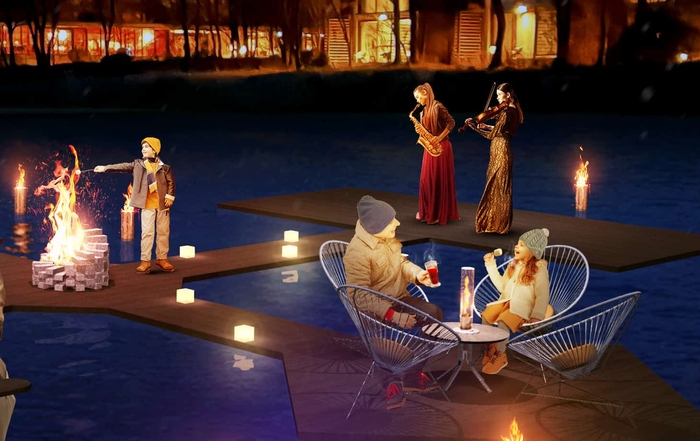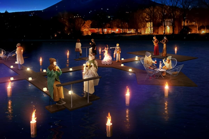 【リゾナーレ那須】焚火に囲まれた水上の特別席が登場。焚火を囲んで楽しむ温かい甘酒やホットドリンク、音楽家による演奏会なども堪能できる「SUIDEN焚火ラウンジ」オープン|期間:2023年1月7日~3月15日