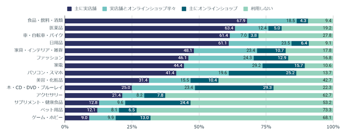 50代以上のECナビユーザーのショッピングは、食品・医薬品・日用品・車関連などは実店舗利用が多く、パソコン・スマホ、本・CD・DVD、サプリメント・健康食品はオンライン比率が高い傾向にあります。食品・医薬品・日用品・車関連などの訴求に関してはネットでの情報提供から実店舗への誘導、また、パソコン・スマホ、本・CD・DVD、サプリメント・健康食品の訴求は、直接オンライン施策の効果が期待できます。