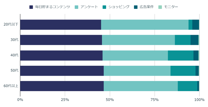 ・毎日ポイントが貯まるコンテンツやアンケートの活用が非常に高く、50代以上のユーザーは参加意欲が高い
