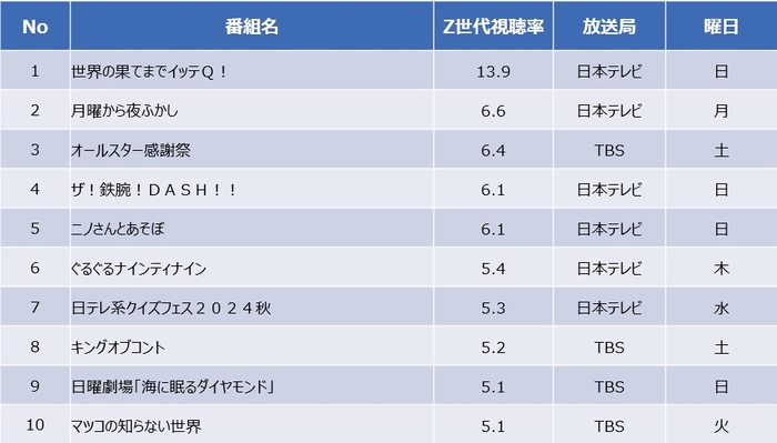 1位に輝いたのは全世代と同じく、日本テレビ系列のバラエティ番組「世界の果てまでイッテQ!」で13.9%。XではZ世代と思しき方々が、手越祐也さんの出演を歓迎しているつぶやきが複数見られました。