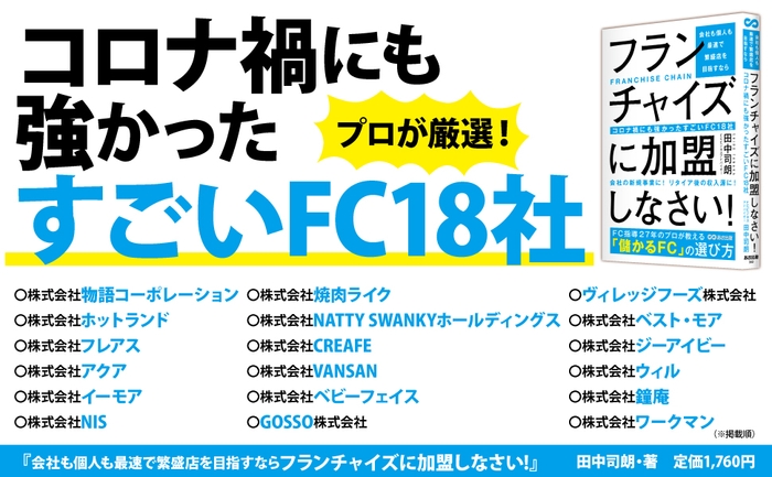 『会社も個人も最速で繁盛店を目指すならフランチャイズに加盟しなさい!――コロナ禍にも強かったすごいFC18社』著者田中司朗が、キンドル電子書籍ストアで配信開始