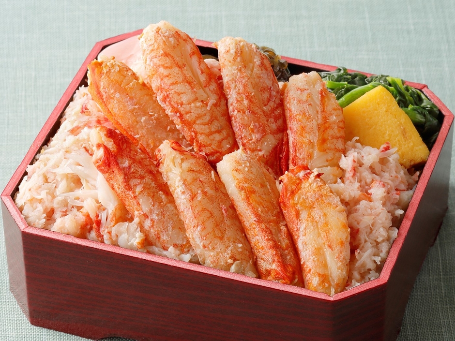 オホーツク海産の毛がにのむき身と棒肉を贅沢に盛り付けた弁当。