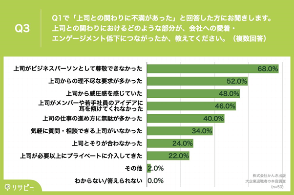 Q1で「上司との関わりに不満があった」と回答した方に、「Q3.上司との関わりにおけるどのような部分が、会社への愛着・エンゲージメント低下につながったか、教えてください。(複数回答)」(n=50)と質問したところ、「上司がビジネスパーソンとして尊敬できなかった」が68.0%、「上司からの理不尽な要求が多かった」が52.0%、「上司から威圧感を感じていた」が48.0%という回答となりました。